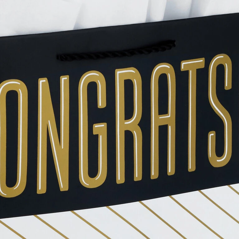 - Large graduation gift bag pack includes 3 assorted designs: tossed grad caps on white, mortarboard on stripes and gold foil banner on black.