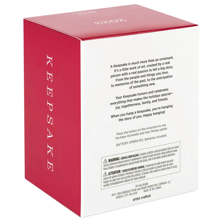 - Key Features: Press the button on the Magic Light and Sound ornament to see the base illuminate and hear Mickey speak.