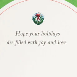 Musical pop-up Christmas greeting card with motion features a laser-cut, three-dimensional snowy scene of an antique red truck and a charming mountain village inside of a 3D snow globe-style design. Musical card plays the song “We Wish You a Merry Christmas” while “snow” blows inside when button on front is pressed. Simply unfold the card to create a fun surprise—no assembly required—that can be displayed all season long. When open for display, 3D pop-up card measures approx. 7″ H.